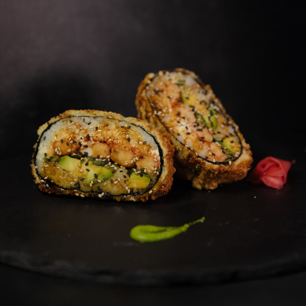 (tempura shrimp, avocado,cucumber, cream cheese, tobiko caviar, sushi rice, nori, sesame seeds, unagi sauce)